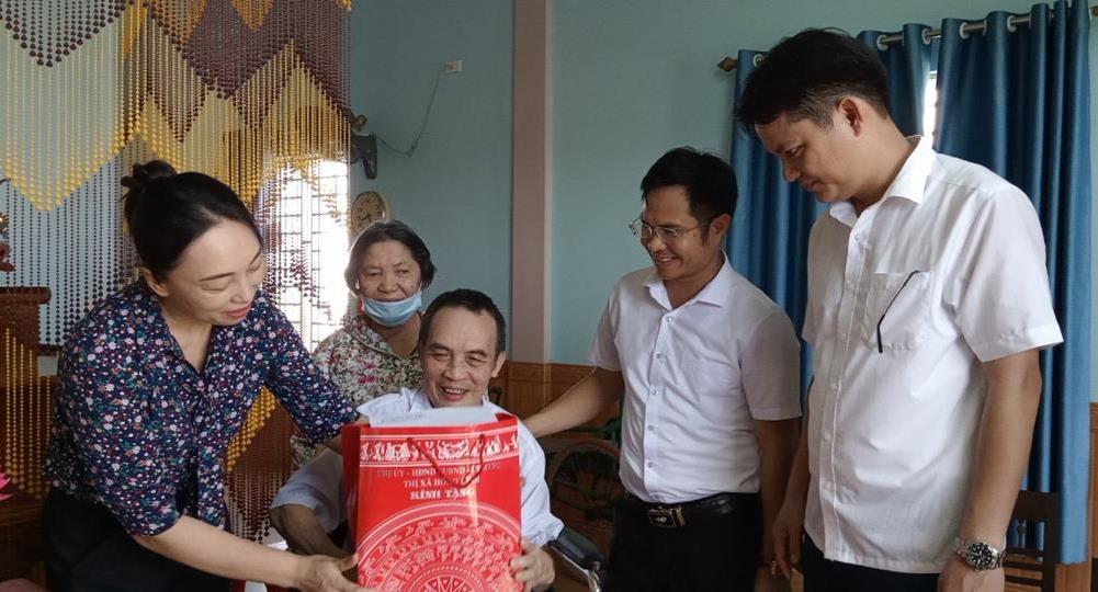 Lãnh đạo Thị xã và lãnh đạo phường Nam Hồng tặng quà ông Nguyễn Xuân Loan, thương binh ¼