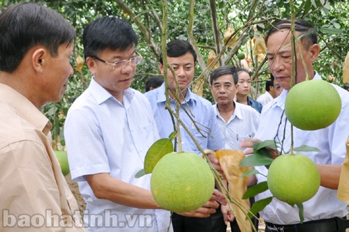 | Phó Bí thư Tỉnh ủy Lê Thành Long kiểm tra mô hình trồng bưởi Phúc Trạch tại xã Lộc Yên. |