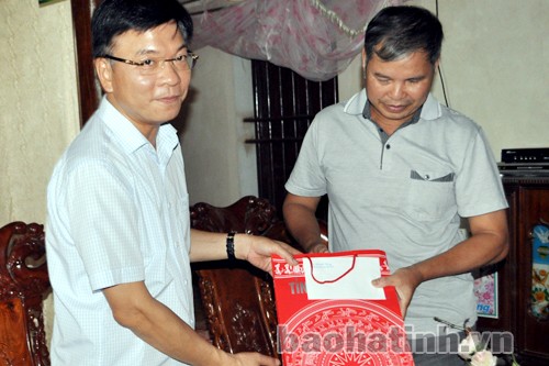 | Phó Bí thư Tỉnh ủy Lê Thành Long tặng quà gia đình chính sách Lưu Đức Khâm (xã Phú Gia). |
