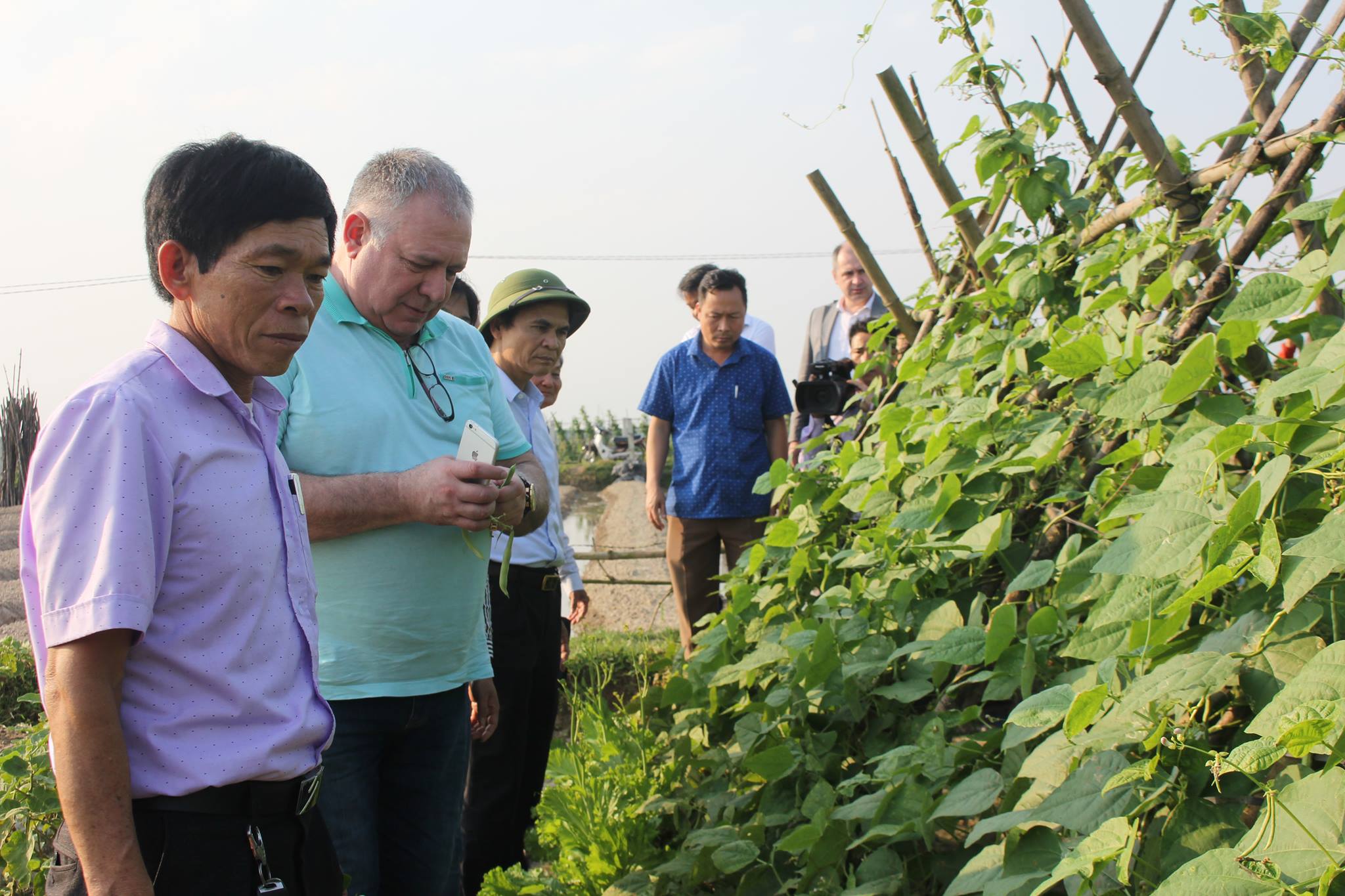 Đại diện doanh nghiệp từ Liên Bang Nga (thứ hai, bên trái) kiểm tra để thương thảo hợp đồng liên kết sản xuất rau, củ, quả tại xã Tượng Sơn, tháng 02/2019