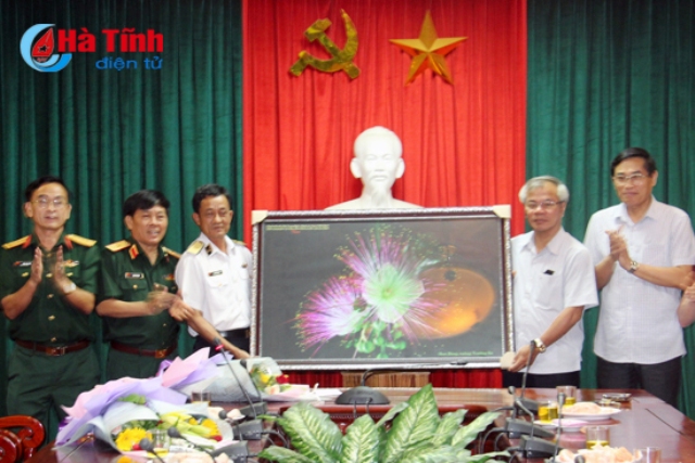 | Gia đình các vị tướng trao tặng tỉnh Hà Tĩnh bức tranh hoa bàng vuông - biểu tượng của Trường Sa thân yêu |
