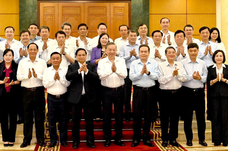 Tổng Bí thư Tô Lâm và các đồng chí lãnh đạo Đảng, Nhà nước với Ban Thường vụ Đảng ủy Quốc hội. (Ảnh: ĐĂNG KHOA)
