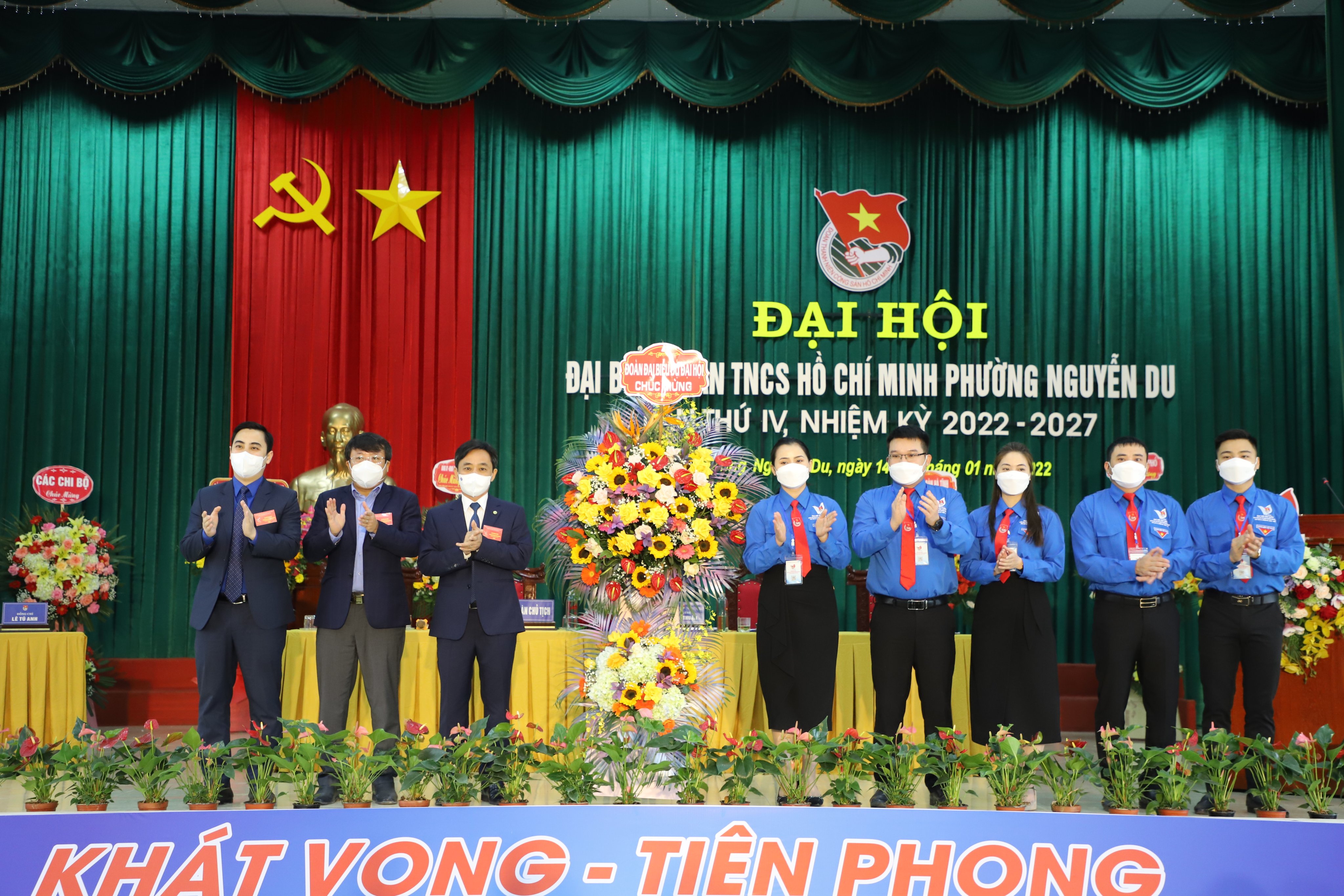 Đồng chí Phó Bí thư Thường trực Tỉnh ủy và đại diện Thường trực Thành ủy Hà Tĩnh dự, tặng hoa chúc mừng Đại hội Đoàn phường Nguyễn Du