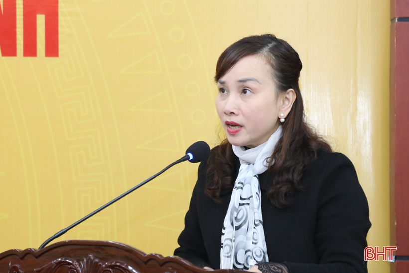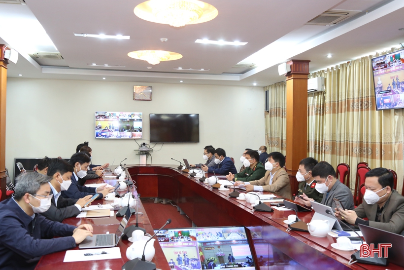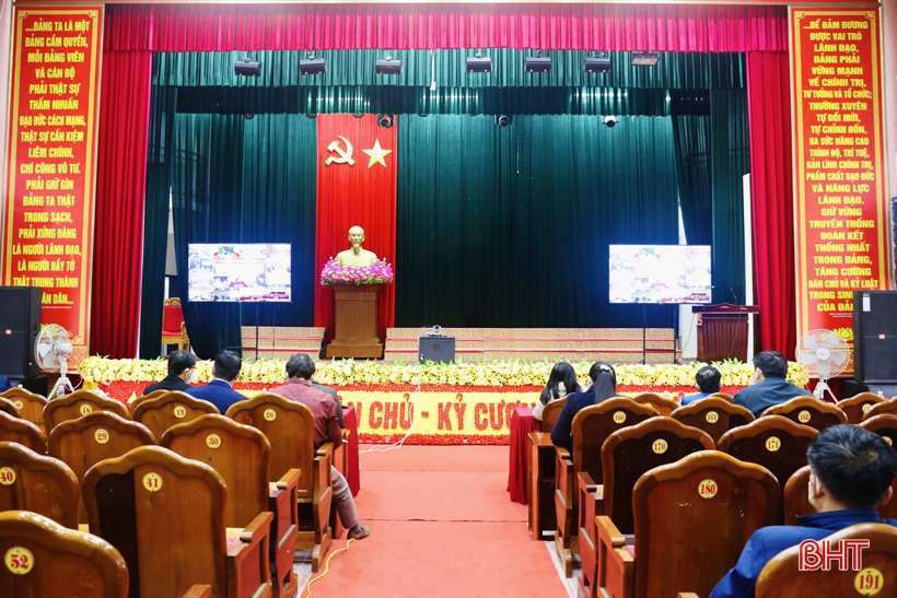 Lãnh đạo các địa phương tham dự tại điểm cầu huyện, thị, thành phố. Ảnh chụp tại điểm cầu huyện Thạch Hà.
