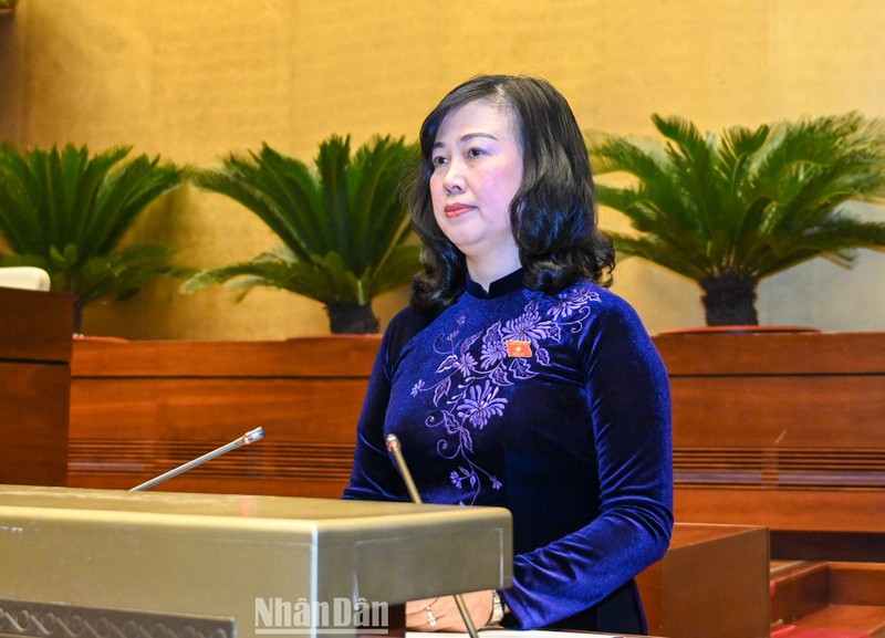 Bộ trưởng Y tế Đào Hồng Lan trình bày Báo cáo đánh giá việc thực hiện quy định tại Nghị quyết số 30/2021/QH15 của Quốc hội về các chính sách phòng, chống dịch bệnh Covid-19. (Ảnh: DUY LINH)